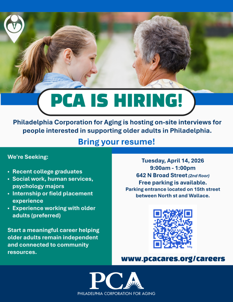 Philadelphia Corporation for Aging is hosting on-site interviews for candidates interested in supporting older adults across Philadelphia. Come ready to interview and learn about meaningful careers that help older adults stay independent and connected. Visit https://pcacares.org/careers/ to learn more.