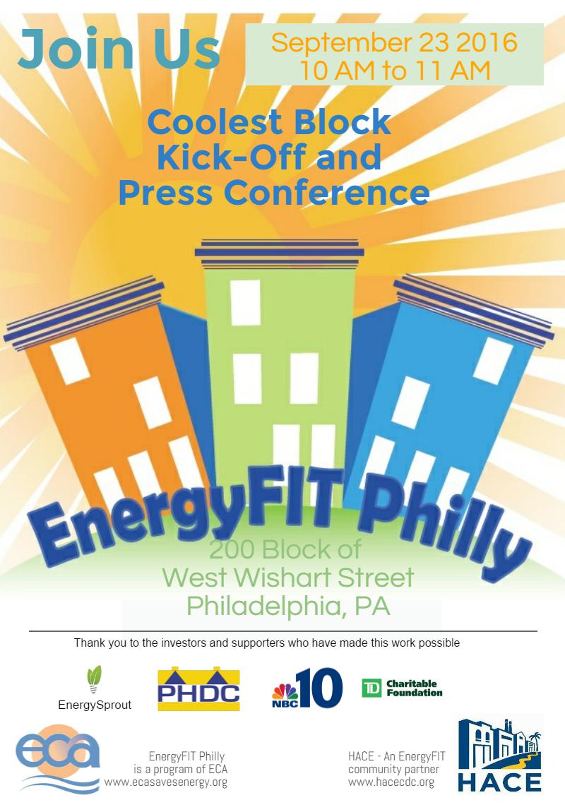 Join Philadelphia’s Energy Coordinating Agency (ECA) and HACE along with residents of the 200 block of West Wishart Street, led by their block captain for the Kick-Off of EnergyFIT Philly on Friday, September 23, 2016 at 10 AM.