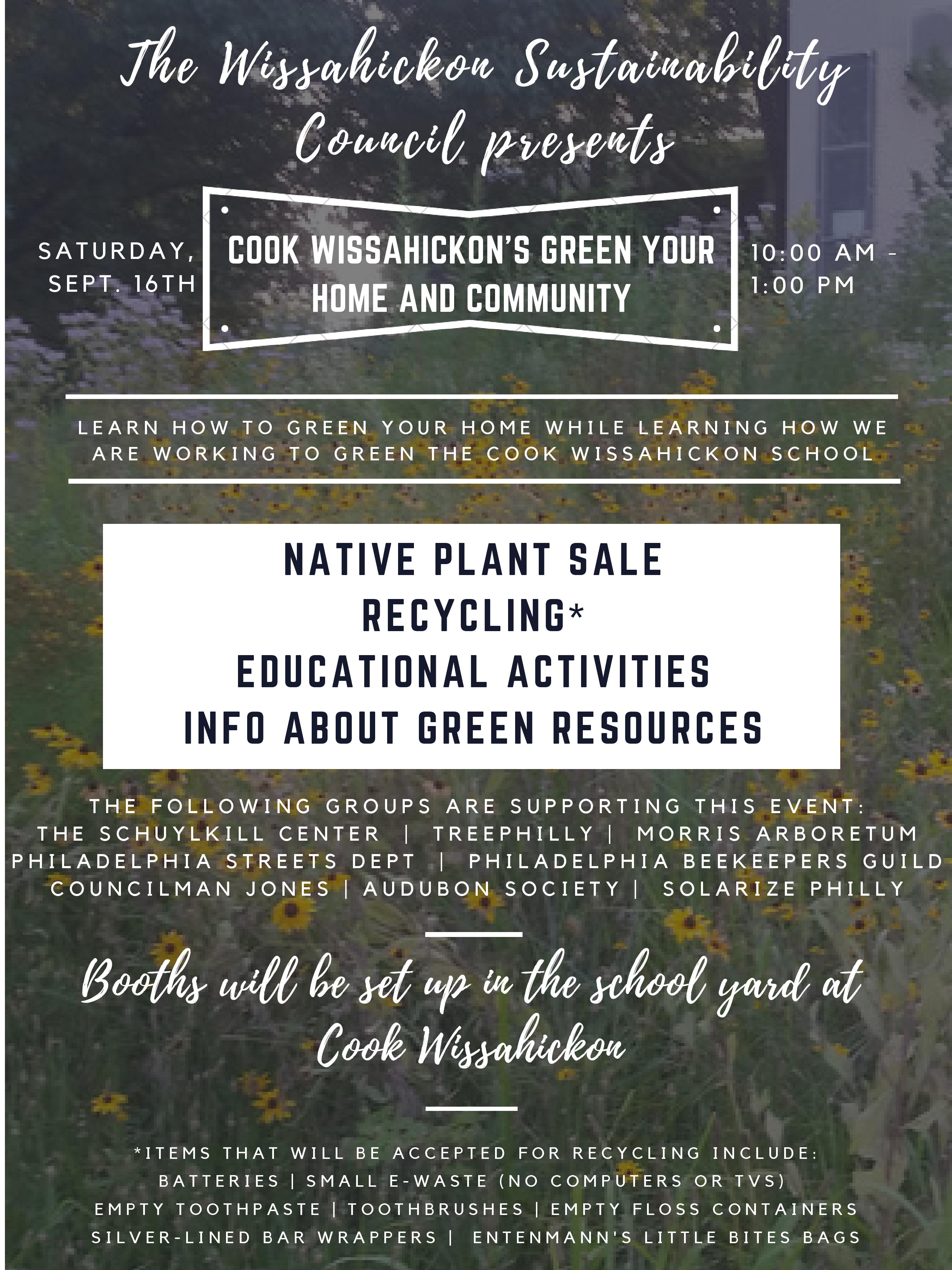 Learn how to green your own home, while learning about what the WSC is doing to green Cook Wissahickon. They will have native plants for sale, recycling, and educational and fun activities for the kids.